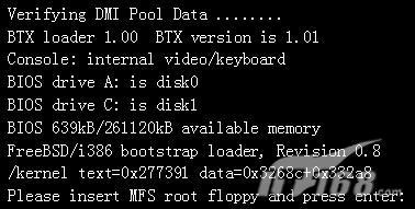 按照屏幕指示,将 kern.flp 软盘取出,换上 mfsroot.flp 然后按Enter键。